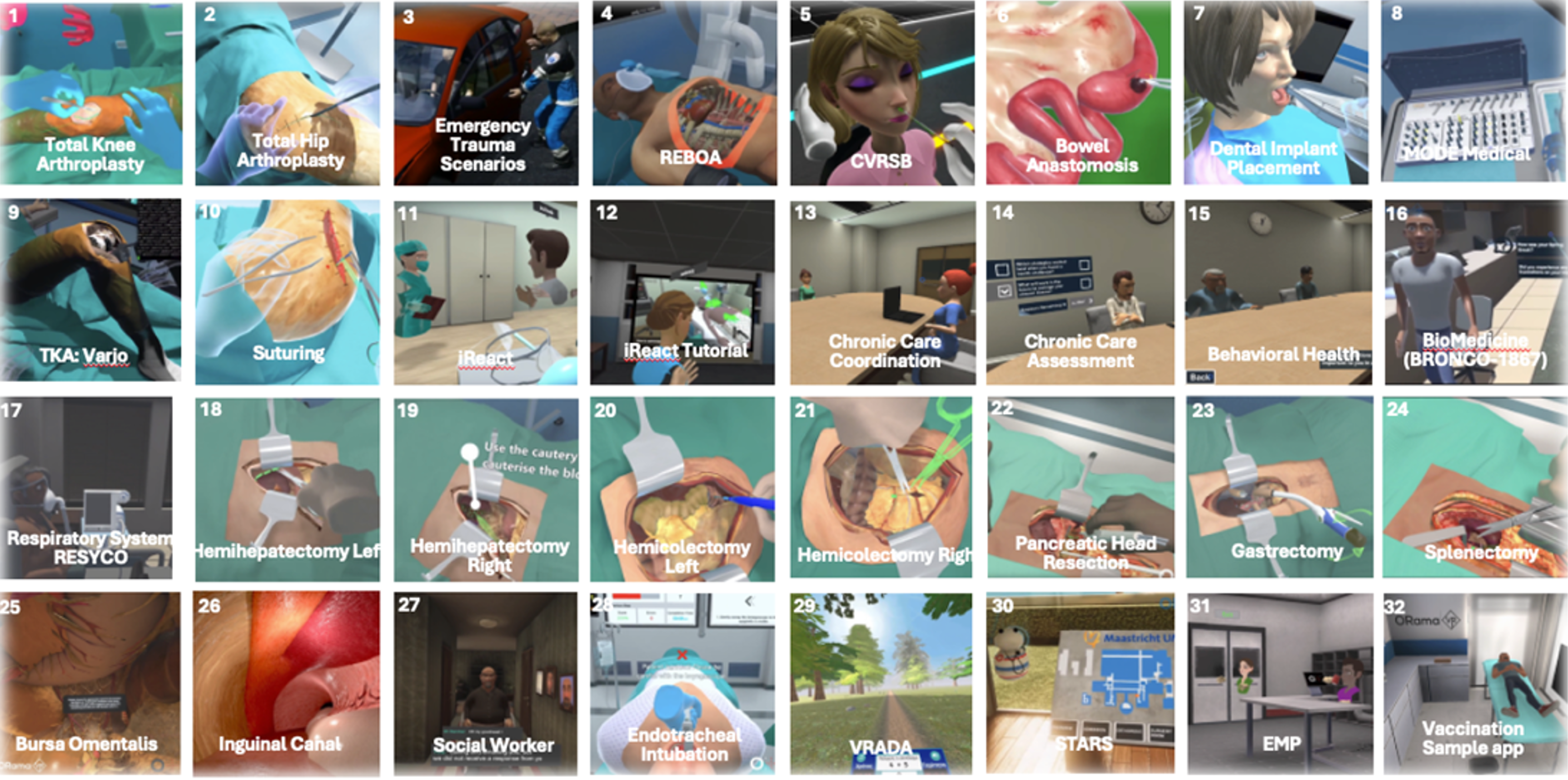 Over 100 computational medical XR simulations across surgical, diagnostics, and therapeutic specialties. New simulations added as ORamaVR and partner institutions build and contribute.
